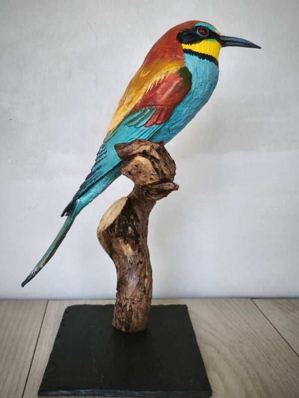Escultura de ave a tamaño real tipo abejaruco o martín pescador. Altura entre 20 y 30 cms. Materiales PETG y metal , soporte madera y pizarra. Pintado a mano. Escultura hecha mediante fabricación aditiva con diseño digital exclusivo. Puede colocarse en el exterior.